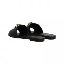 These sandals are not just a pair of shoes; they are a statement of sophistication. The sleek black leather combined with the gold metal logo plaque exudes elegance, making them a versatile addition to your wardrobe. The open-toe design ensures breathability, while the leather sole offers both comfort and longevity. Whether you’re heading to a casual brunch, a day out with friends, or even a poolside event, these sandals are the ideal choice.