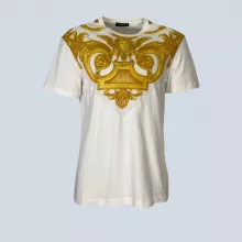 Step up your fashion game with this striking Versace Medusa print t-shirt. Crafted from 100% premium cotton, this t-shirt brings an elevated twist to a classic wardrobe staple. Featuring a crew neck and short sleeves, the t-shirt offers both comfort and style, making it the perfect addition to any fashion-forward wardrobe. The bold white and gold color combination, along with the iconic Medusa print, makes this t-shirt stand out in any setting.
