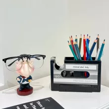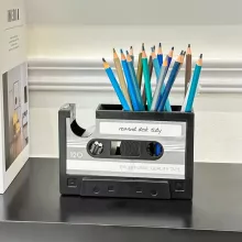 Designed to capture the look of a classic cassette tape, this pen holder doubles as a tape dispenser, making it both decorative and practical. Its sturdy construction ensures stability on your desk, while its spacious compartment easily holds writing tools and small office essentials. The built-in tape cutter is perfectly positioned for quick, hassle-free use. Measuring approximately 6.3 inches in length, it fits comfortably on any desk without taking up too much space.