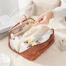 Made from durable PU leather, the bag is both lightweight and water-resistant, offering excellent protection for your makeup, creams, perfumes, and more. The practical pillow-shaped design features a wide opening with a zipper, giving you a full view of the contents, so you can quickly locate what you need without any hassle. Available in beautiful color options like brown, white, pink, and black, this cosmetic bag combines both elegance and functionality in one.
