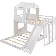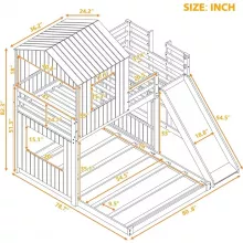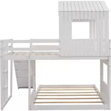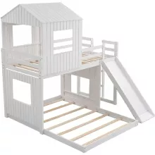 Turn bedtime into an adventure with the charming and functional White Twin Loft House Bunk Bed with Slide and Roof. Designed to spark imagination and provide endless hours of fun, this bunk bed is the perfect centerpiece for any child’s bedroom. Crafted from sturdy pine wood and MDF, this durable bed ensures safety, stability, and long-lasting use. Its multifunctional design combines a cozy sleeping area with a whimsical playhouse, complete with a slide, roof, and playhouse-inspired windows.