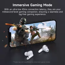 Equipped with a 10mm dynamic driver and aluminum alloy diaphragm, these earbuds produce rich bass, clear treble, and balanced mid-tones across all music genres. Gamers will love the ultra-low 43ms latency in game mode, providing lag-free audio that perfectly matches every action on screen. Activate game mode with a simple triple tap for seamless performance.