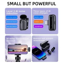 Whether you’re a content creator, a professional in need of high-quality audio for virtual meetings, or someone who frequently livestreams, this microphone is designed to meet your needs. The three-level AI noise reduction ensures that background distractions don’t affect your sound, allowing your voice to stand out clearly and naturally. With up to 30 meters of wireless transmission, you can engage with your audience or participants without worrying about being restricted by cables.